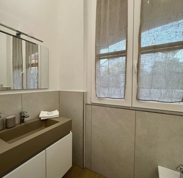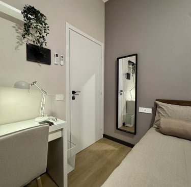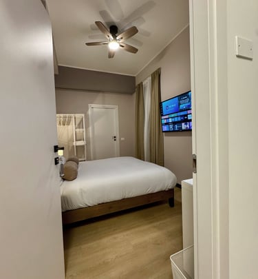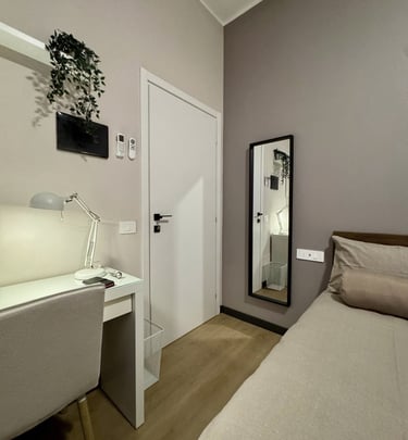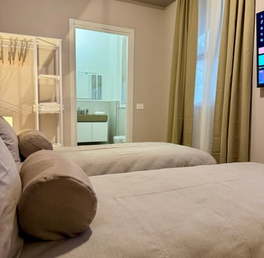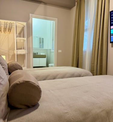Le camere sono moderne, con un bellissimo parquet spc e muri tinteggiati con diverse tonalità di beige, blu o verde a seconda della camera.